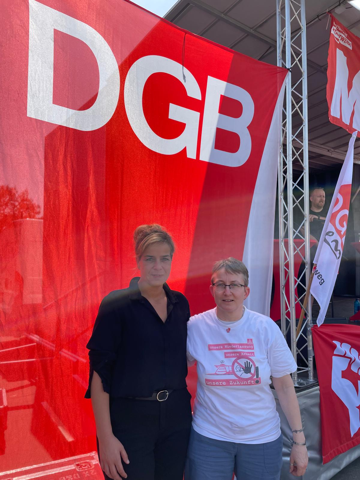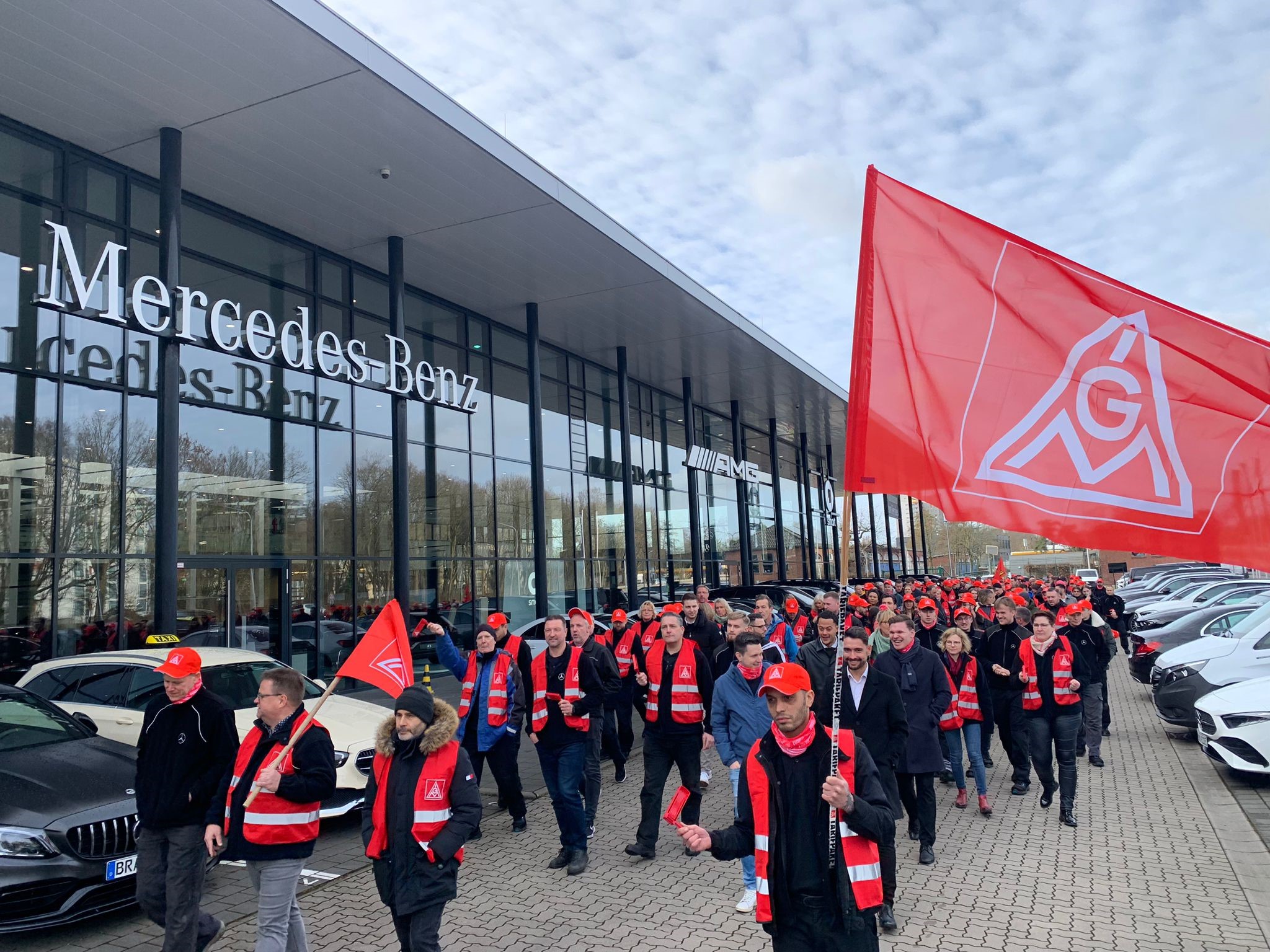 Mercedes-Benz Berlin mit IG Metall-Fahne